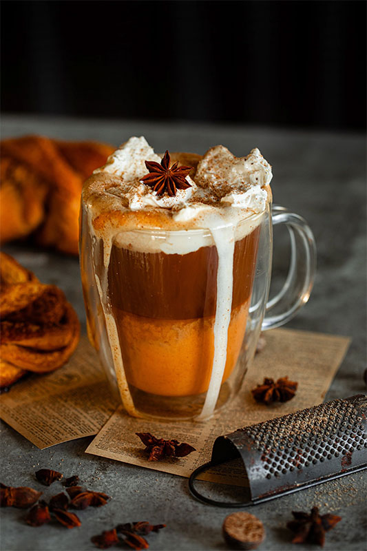 Молоко підігріваємо і збиваємо в піну. Додаємо гарбузове пюре яблуко і грушу. Доливаємо мед і корицю. Заливаємо в склянку спочатку пюре а потім молочну піну. Прикрашаємо мілко тертою грушою.