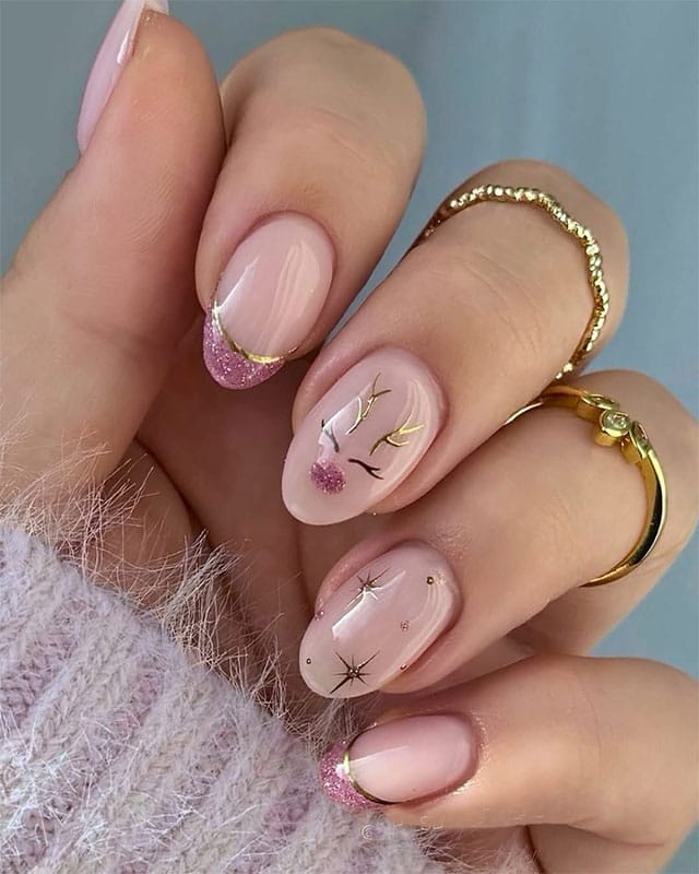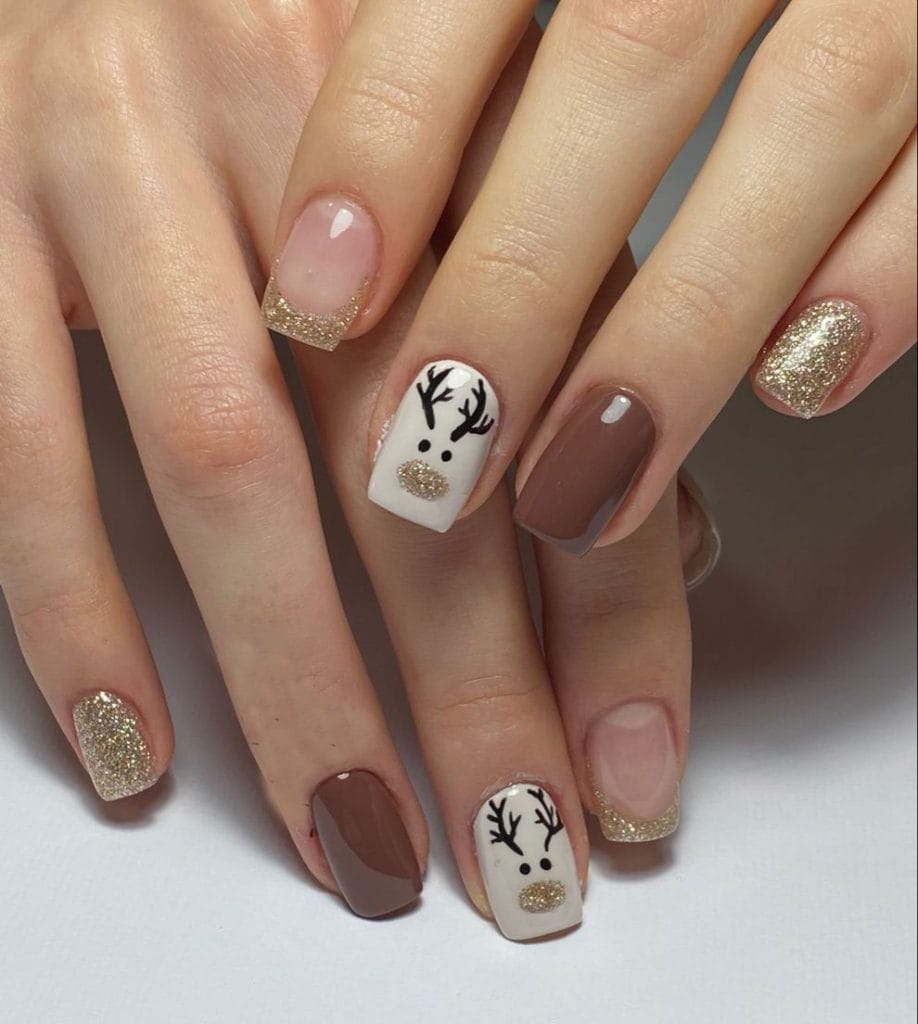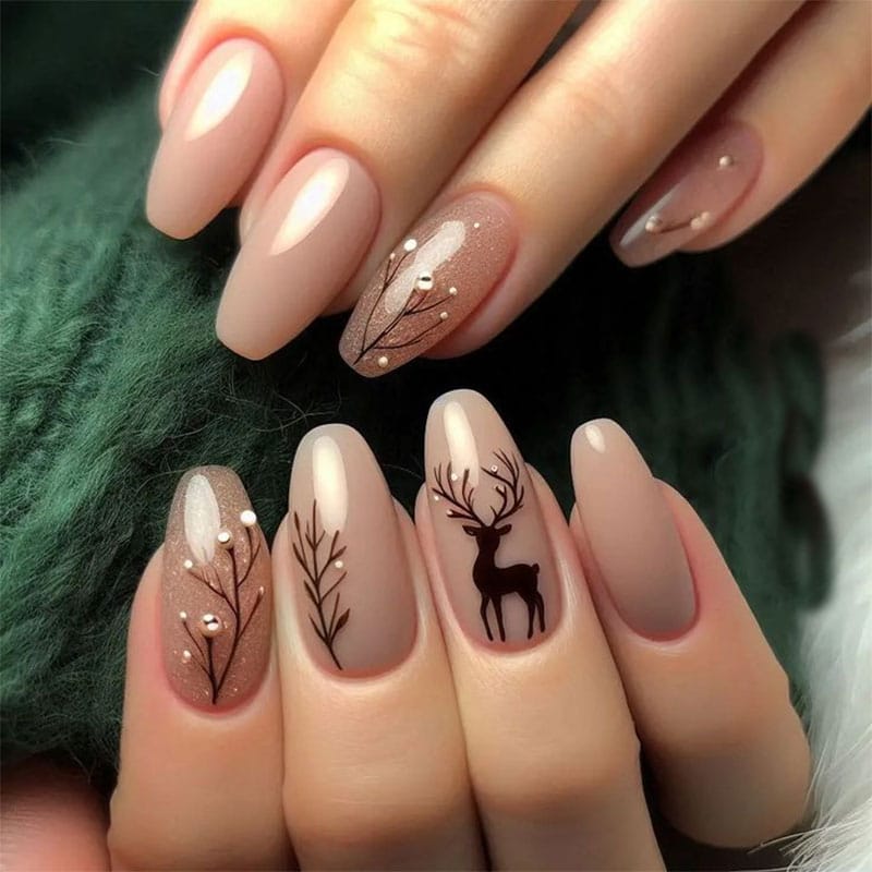 У манікюрі дизайн легко підлаштовується під різні стилістичні рішення. Серед найпопулярніших варіантів — французький манікюр, де «оленячий» принт застосовується лише на кінчиках нігтів. Такий спосіб дозволяє познайомитися з трендом без надмірної яскравості.