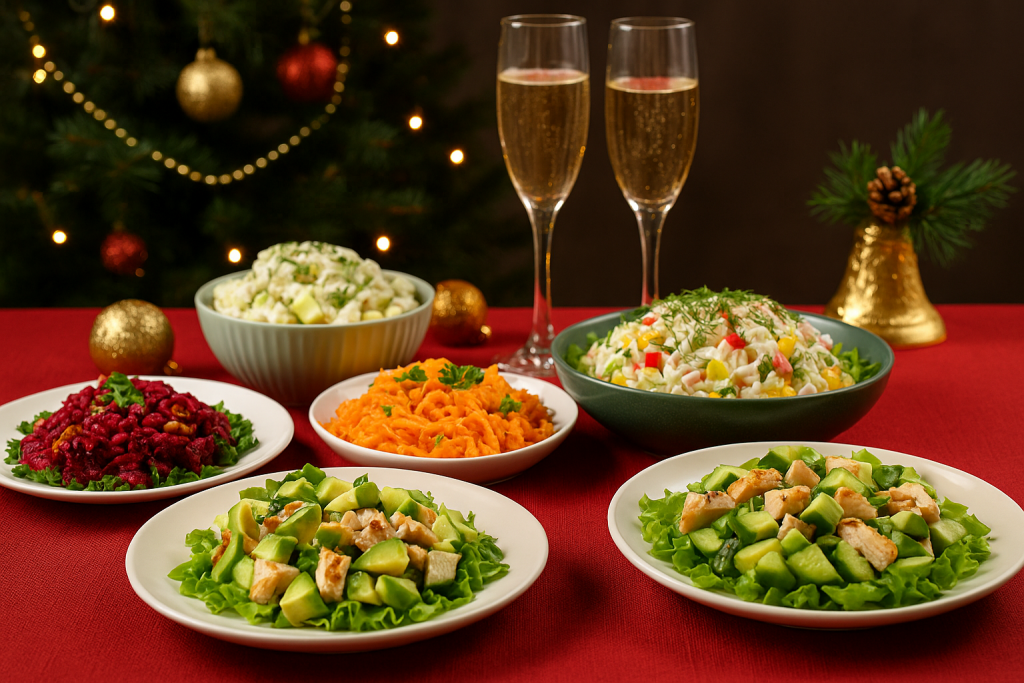 Коли до Нового року лишається кілька днів, я починаю думати не про складні страви, а про те, як зробити стіл теплим і живим. Мені хочеться, щоб салати на Новий рік були легкими, різними за смаком і такими, щоб гості з першої ложки відчули свято. Я люблю прості рецепти, але з родзинкою, і завжди додаю щось свіже, щоб меню не здавалося важким. Тому нижче я зібрала новорічні салати, які готуються без метушні, виглядають святково й реально тішать гостей. Святкові салати, які створюють дух Нового року Я завжди бачу, як змінюється атмосфера, коли на столі з’являються святкові салати. Овочеві салати на Новий