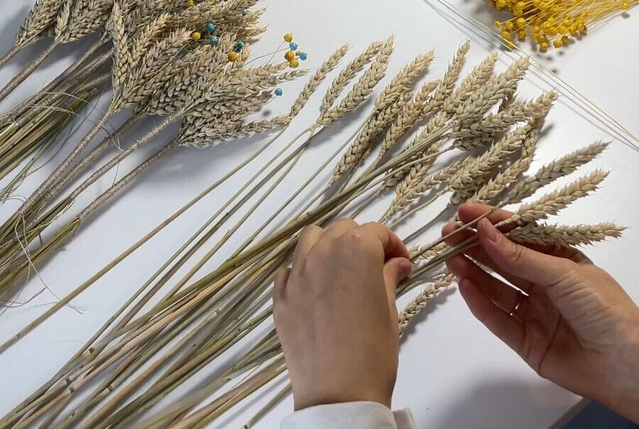 Спершу я розкладаю колоски чи соломку на столі і підбираю пучки приблизно однієї довжини. Якщо матеріал дуже сухий і ламається, злегка загортаю його у вологий рушник на кілька хвилин, тоді стебла стають гнучкі.