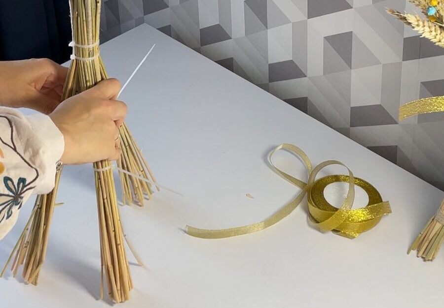 Я беру найбільший пучок і складаю щільний сніп, вирівнюю низ ножицями, щоб він стояв рівно. Потім туго перевʼязую ниткою трохи вище середини, це майбутня талія дідуха і вона тримає всю форму.