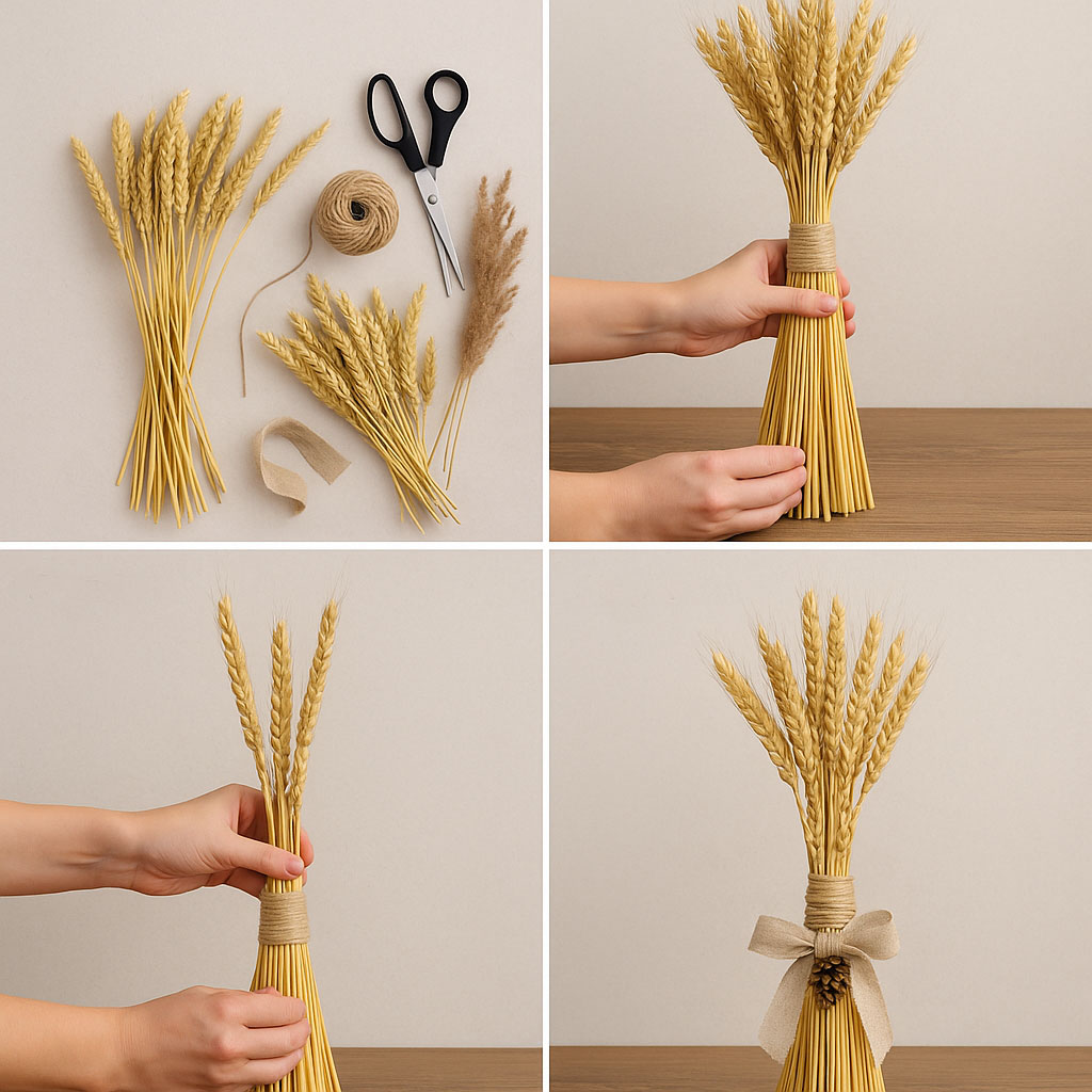 Я вставляю найгарніші колоски чи сухі трави у верхню частину, щоб вона стала пухнастою. Талію закриваю стрічкою або тканиною і додаю 2–3 натуральні акценти, наприклад шишку чи горіх.