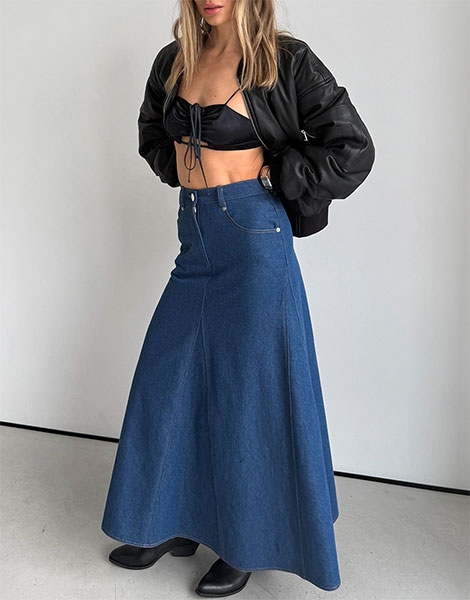 Сьогодні в тренді — максіспідниці зі щільного деніму, які виглядають витончено й елегантно. Довгі фасони можуть мати розрізи або легкий кльош, що додає образу динамічності та жіночності. Такі моделі чудово поєднуються з м’якими в’язаними светрами, сорочками оверсайз, класичними черевиками, створюючи стильний і зручний лук, який відповідає концепції «міського комфорту», що є бажаною для багатьох сучасних жінок.