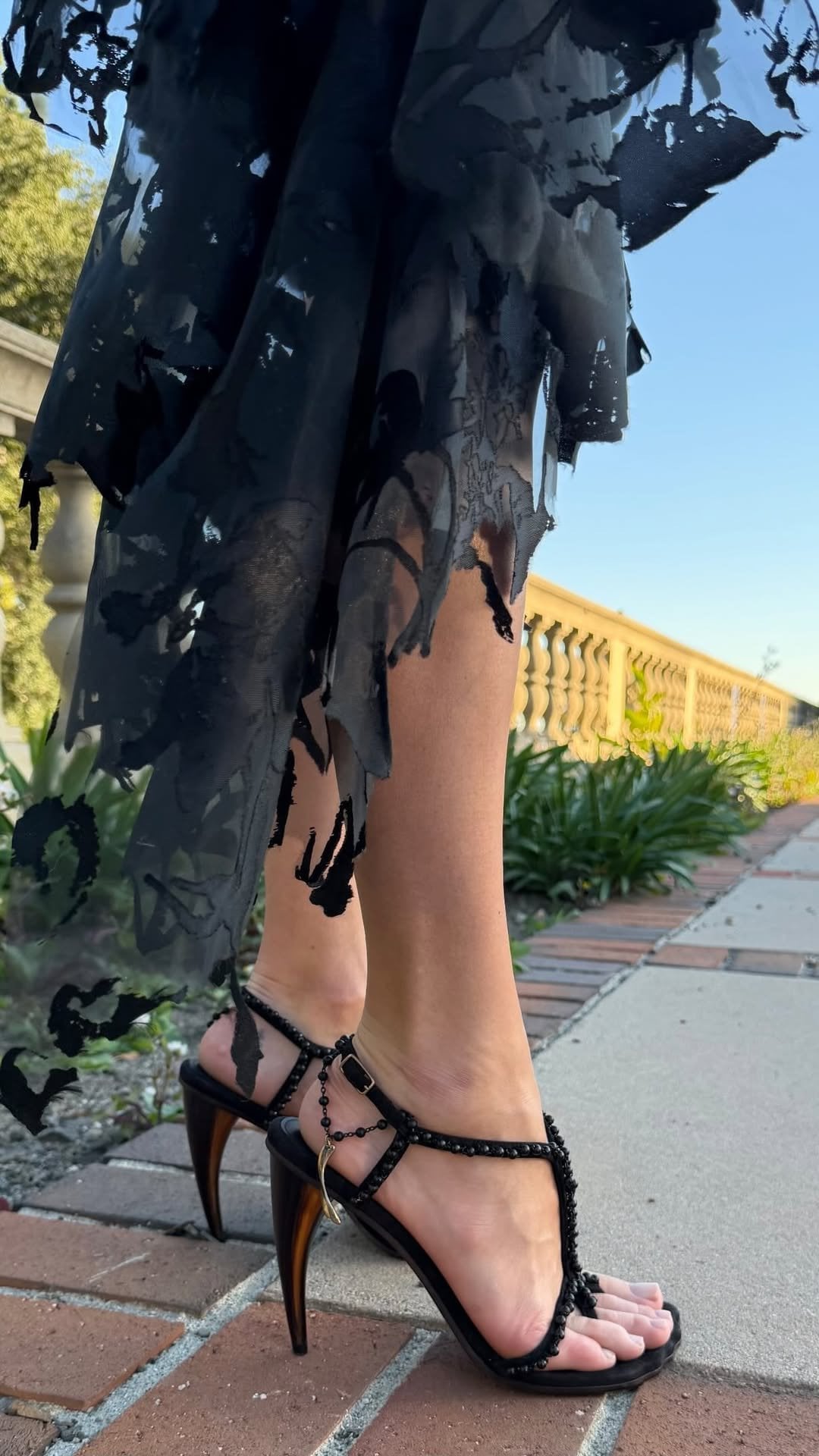 Ця сукня була зовсім прозорою, короткою, з асиметричним подолом та довгими рукавами. Вбрання було повністю прикрашене квітковими візерунками та мало декольте. Ця сукня, як і взуття Марго з Т-подібними ремінцями та підборами у вигляді рогів, були з колекції весна-літо 2026. Також вона доповнила лук окулярами з темними лінзами та сережками.