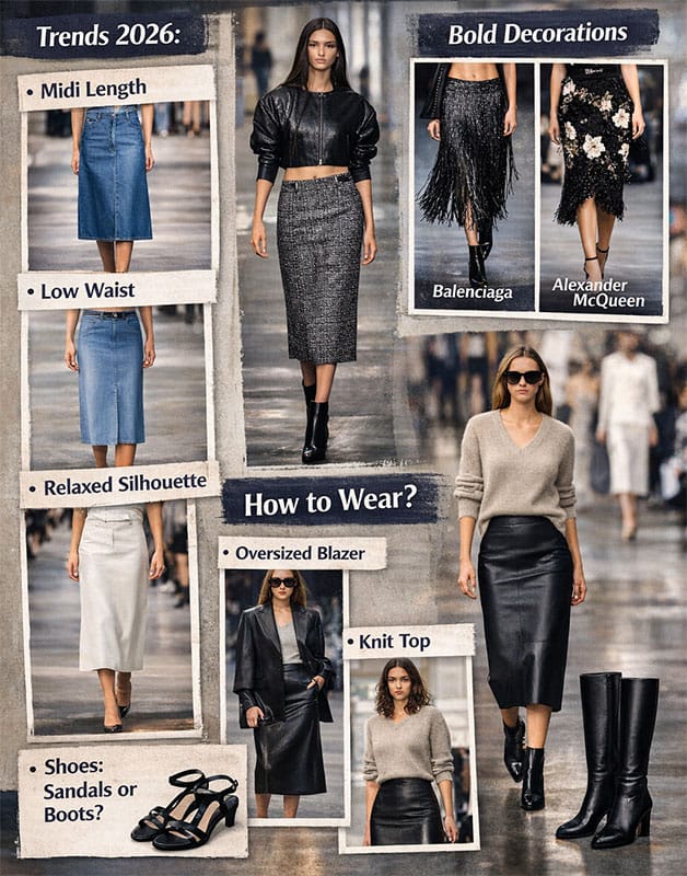 Таким чином, спідниця-колона у весняно-літньому сезоні 2026 року пропонує широкий спектр варіантів як у дизайні, так і в поєднанні з іншими елементами одягу. Вона зберігає свою класику, додаючи сучасних акцентів і варіюючи матеріали, що робить її ідеальним вибором для модниць, які цінують поєднання стилю та комфорту.