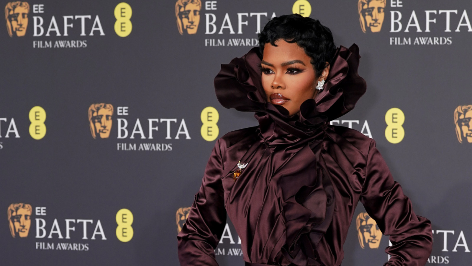 2. Теяна Тейлор виділилася химерністю та драматизмом, звертаючись до історичних алюзій. Для виходу на червону доріжку вона вибрала модель Burberry глибокого баклажанового кольору, із зібраним силуетом, довгим шлейфом та об’ємним коміром-рафом, що майже приховував обличчя й відсилав до вікторіанської естетики, але у сучасній інтерпретації.