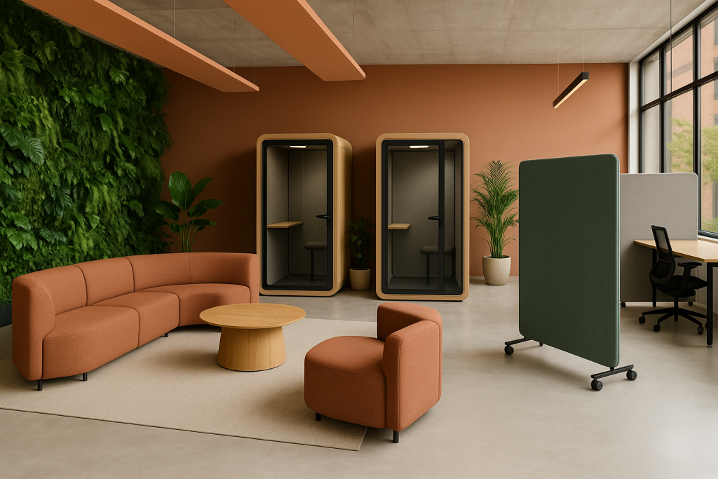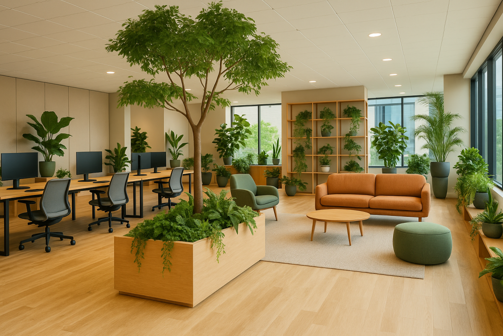Важливу роль у формуванні здорового ритму дня відіграють максимальне використання природного освітлення та циркадне регулювання світла. Акустичні панелі з текстурою моху чи деревини забезпечують затишок та відчуття приватності навіть у великих open space зонах. Окрім традиційних рослин, все частіше застосовують вертикальні сади та зелені стіни, які не лише покращують акустику, а й сприяють створенню балансу в робочому просторі.
