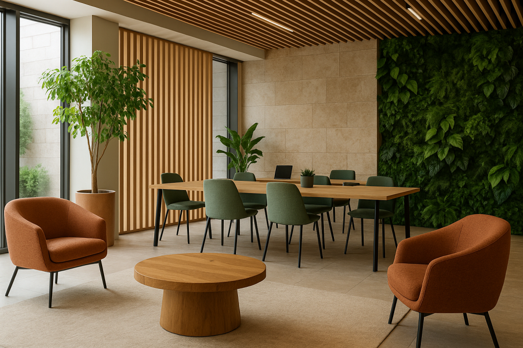 Найпомітнішою тенденцією залишається інтеграція природних елементів у сучасні офісні інтер’єри. Біофільний дизайн уже не розглядається як модне нововведення – він перетворюється на обов’язкову складову будь-якого проекту. У 2026 році офіси наповнюються теплими відтінками, серед яких переважають теракотовий, різноманітні тони мокко та насичений зелений колір. Дерев’яні поверхні, камінь та тактильні текстильні матеріали створюють атмосферу заспокоєння, що допомагає комфортніше переносити інтенсивність робочих циклів.
