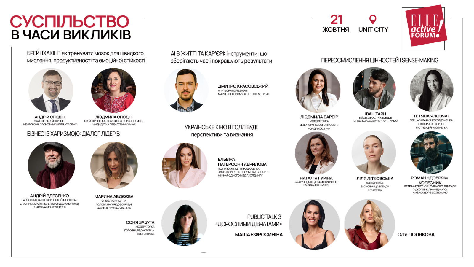 Цьогорічна тема ELLE Active Forum — «Суспільство в часи випробувань». У рамках заходу буде організовано низку панельних дискусій, присвячених переосмисленню базових цінностей, формуванню стійкості, підтримці солідарності та розвитку інтелектуального потенціалу.