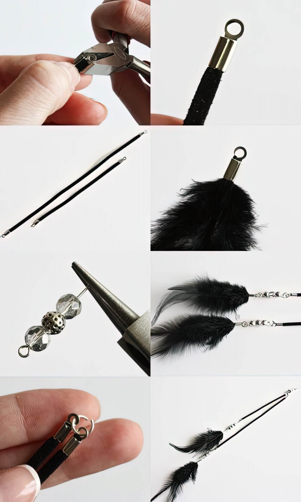 Створіть трендову прикрасу власноруч! Для цього вам знадобиться пір’я, замшевий шнур, фурнітура та інструменти для роботи з нею.
