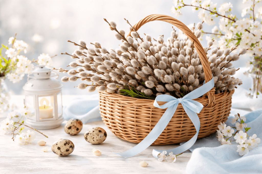 Гарна святкова листівка не обов’язково має бути яскравою чи перевантаженою деталями. Часто найкраще виглядають спокійні композиції з вербовими гілочками, сонячним світлом, ніжними весняними кольорами та кількома теплими словами. Для старших людей особливо важливо, щоб текст був великим і добре читався.