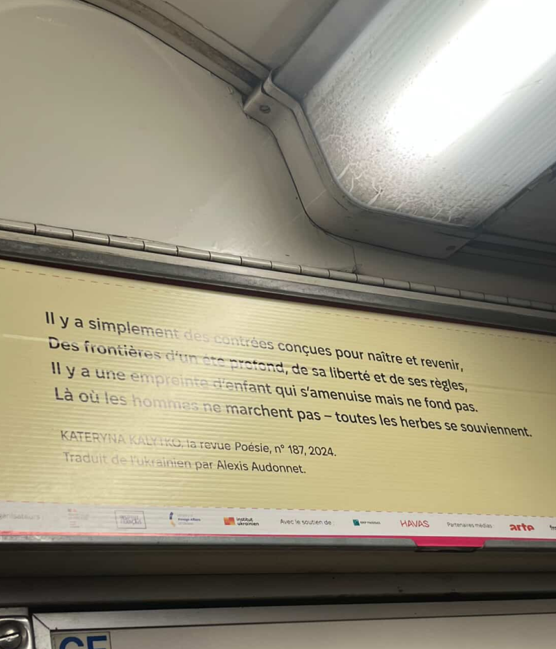А потім Тетяна написала мені, що транспортна компанія RATP у співпраці з Українським інститутом у Франції хоче використати мій переклад вірша Калитко для розміщення в паризькому метро — в межах культурного проєкту.