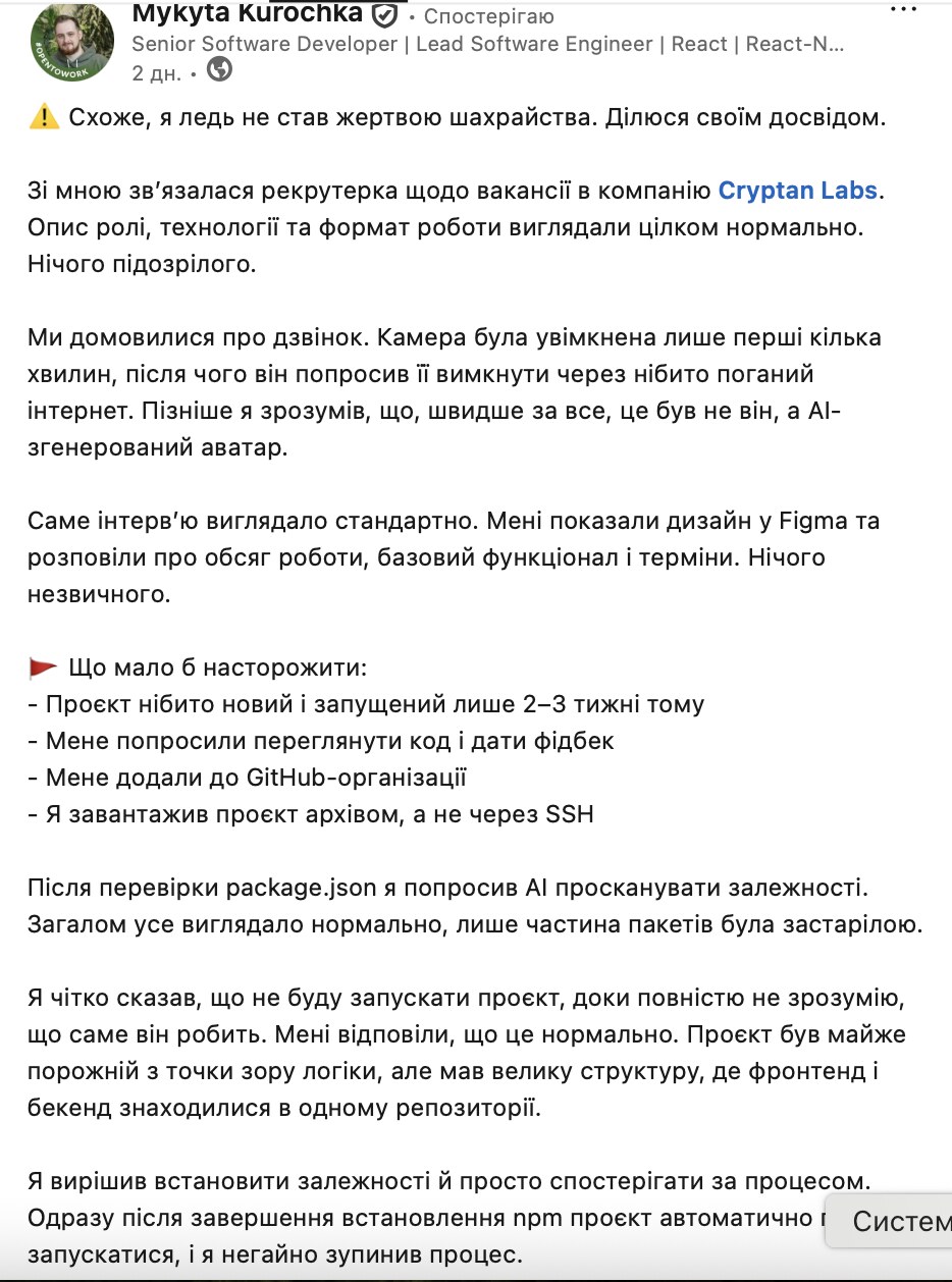 Senior Software Developer Микита Курочка поділився в LinkedIn досвідом, який міг перетворитися на кіберзлочин. За його словами, він ледь не став жертвою шахрайства під час співбесіди на позицію в компанії Cryptan Labs.