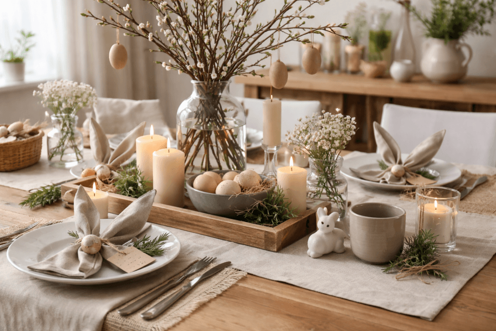 Найшвидше рішення це використати те, що вже є вдома. Підійдуть світлі тарілки, тканинні серветки, прості свічки, баночки замість ваз і свіжі гілочки. За 20–30 хвилин можна оновити стіл і додати кілька акцентів у кімнаті.