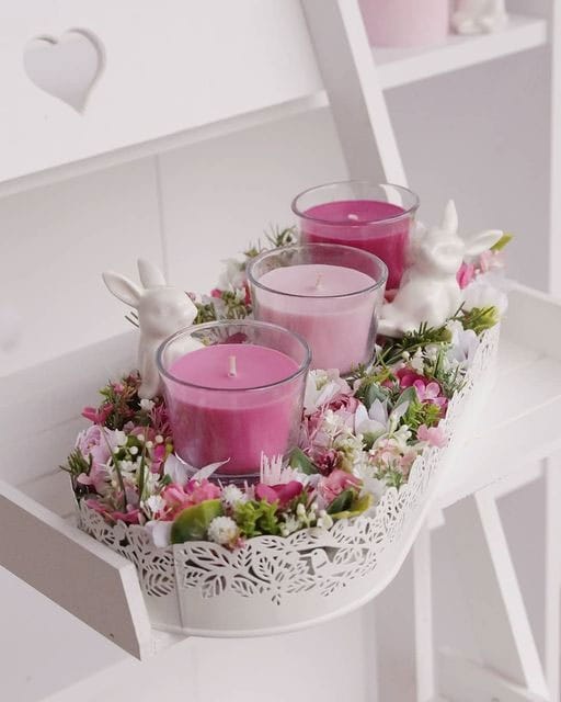 Замість готової композиції можна взяти піднос, поставити на нього одну або кілька свічок, додати тарілку з яйцями та невелику вазу з гілочками. Такий варіант виглядає цілісно і не потребує великих витрат.