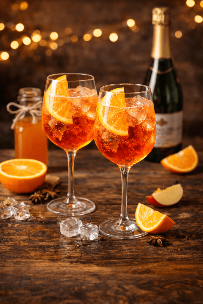 «Апероль шпріц» — це класичний аперитив на основі ігристого вина просекко та апероля. У безалкогольному варіанті апероль замінюють на гіркий апельсиновий сироп, а просекко — на безалкогольне ігристе вино.