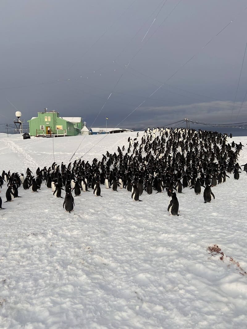 Попри всі незручності, пінгвіни — це абсолютна милота. І ми намагаємося не порушувати їхнього життя, наскільки це можливо. Наприклад, у нас на майданчику є контейнер для збору опадів, розміщений на висоті двох метрів, і до нього йде невеличка драбина. Під нею зазвичай є декілька гнізд, у яких пінгвіни виводять пташенят. Для колег це справжній виклик — обійти їх настільки обережно, щоб не потривожити птахів.
