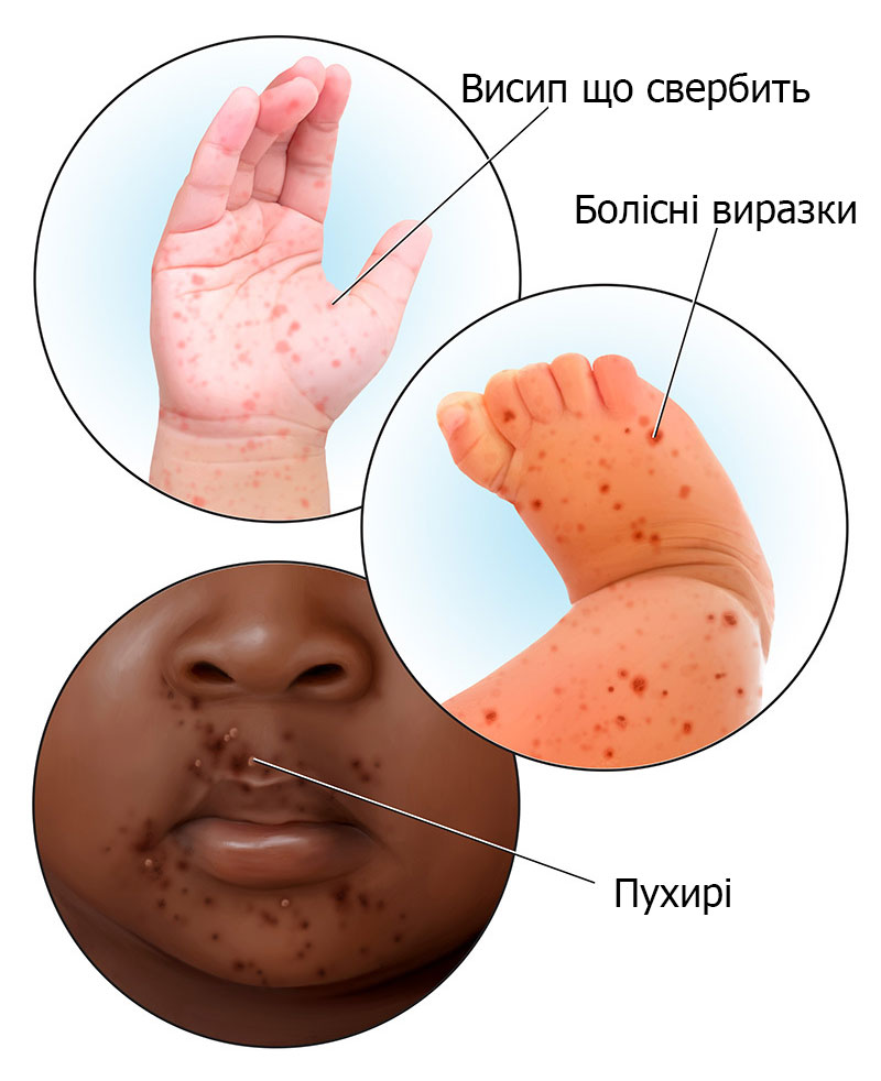 Перші прояви схожі на застуду: температура до 39, слабкість, біль у горлі, іноді нежить. Через кілька днів з’являються характерні пухирці на долонях, ступнях і навколо рота. У роті можуть бути болючі виразки, через які дитина відмовляється їсти чи пити.