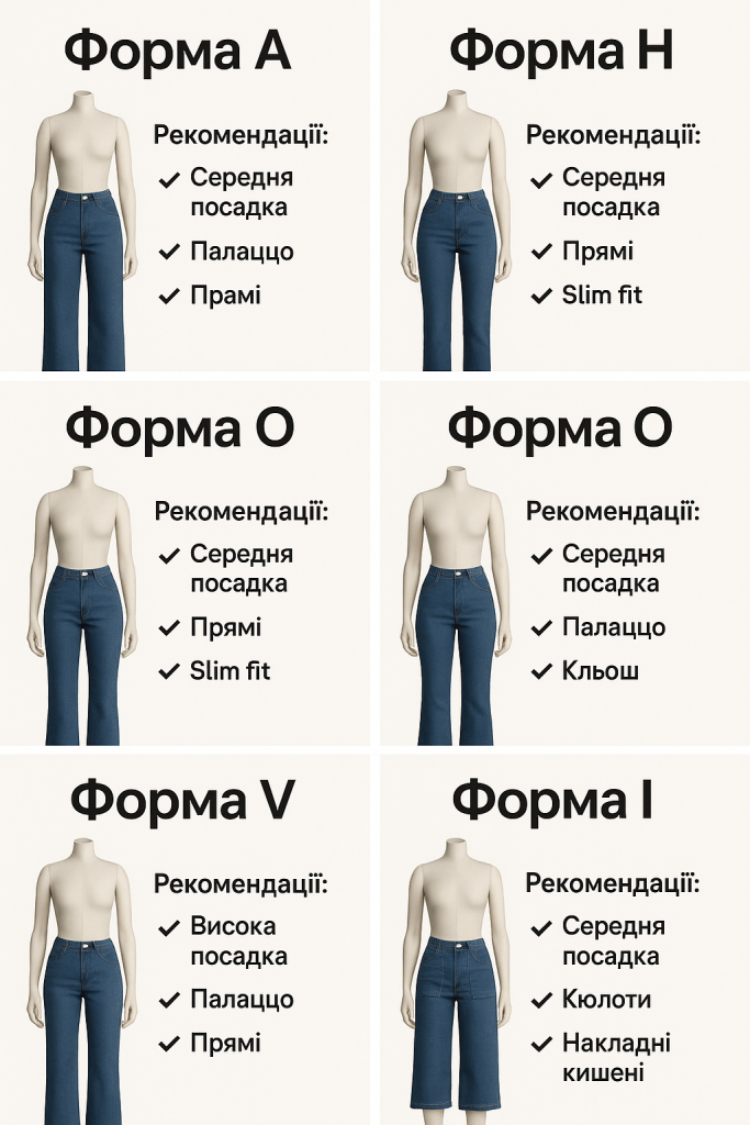 Цей тип фігури характеризується більш виразною нижньою частиною тіла, коли стегна трохи ширші за плечі. Для такого типу ідеально підійдуть джинси зі середньою посадкою, фасони палаццо або прямого крою, виконані з більш щільного деніму.