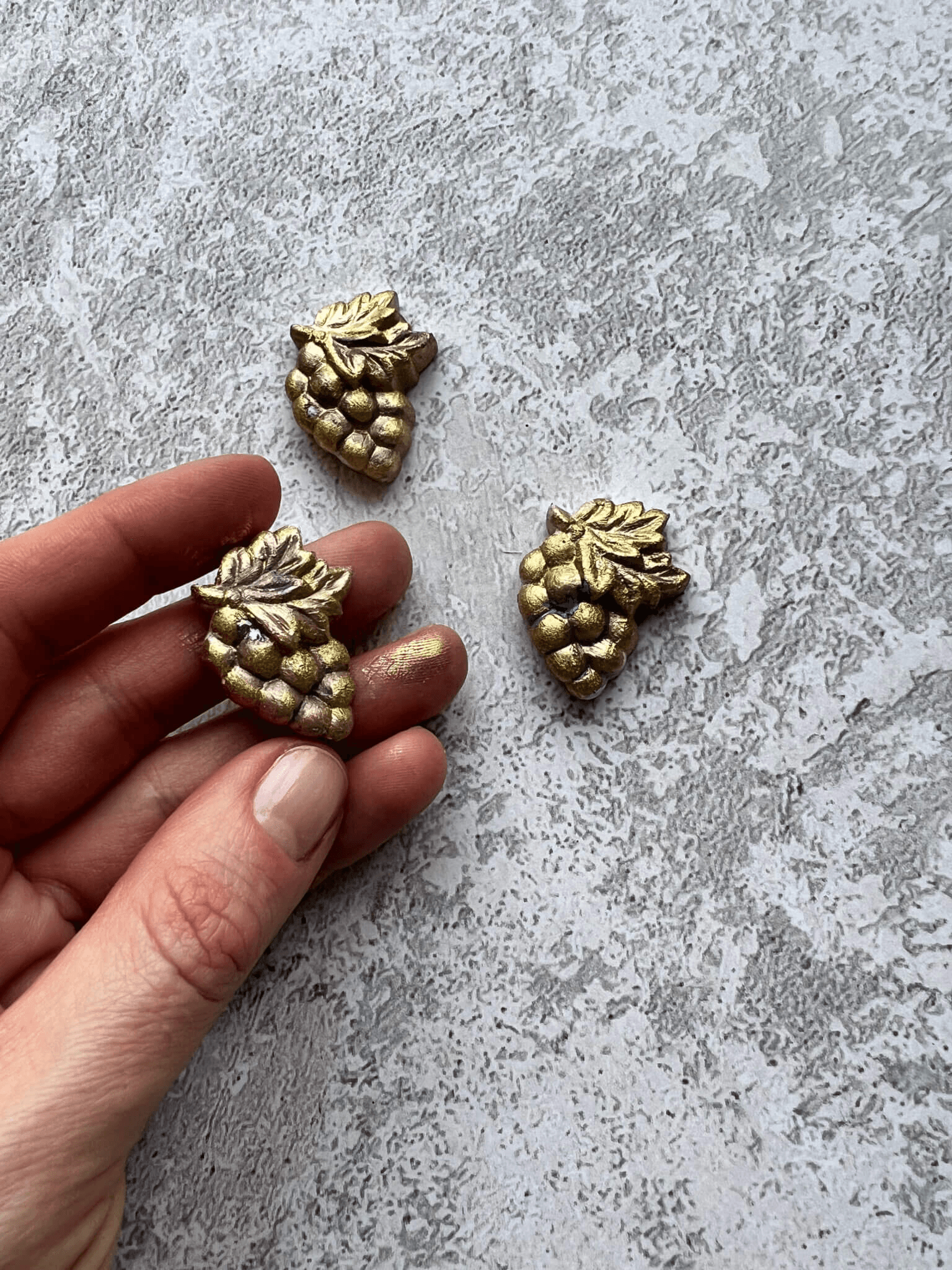 Покриваємо гіпсові заготовки клеєм-лаком. Ми обрали три заготовки, щоб протестити всі три реагенти з набору патіни – блакитний світлий, зелений та блакитно-зелений. Замість клею-лаку можна використовувати акриловий грунт.